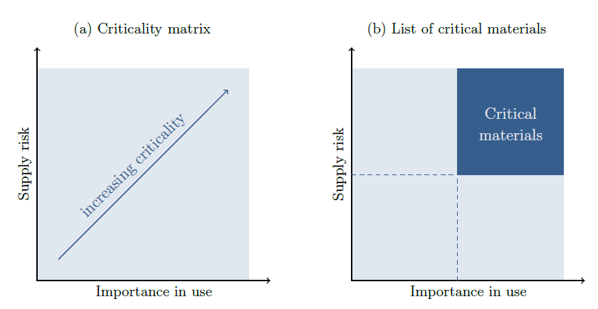 Although there is still no single definition or methodology for assessing criticality, most existing studies are based on the theoretical framework defined by the National Research Council in 2008. This approach conceptualizes criticality not as a categorization, but as a continuous measurement assessed according to two dimensions: importance in use and supply risk. Importance in use is determined by the cost or impact of a supply disruption, while supply risk represents the probability of such a disruption. These two criteria are combined in a two-dimensional graphical representation called a criticality matrix (Figure 1a). The higher up and the further to the right a metal is on this matrix, the more critical it is considered to be. Thresholds can be applied on both axes to define a list of critical materials, as illustrated in Figure 1b.