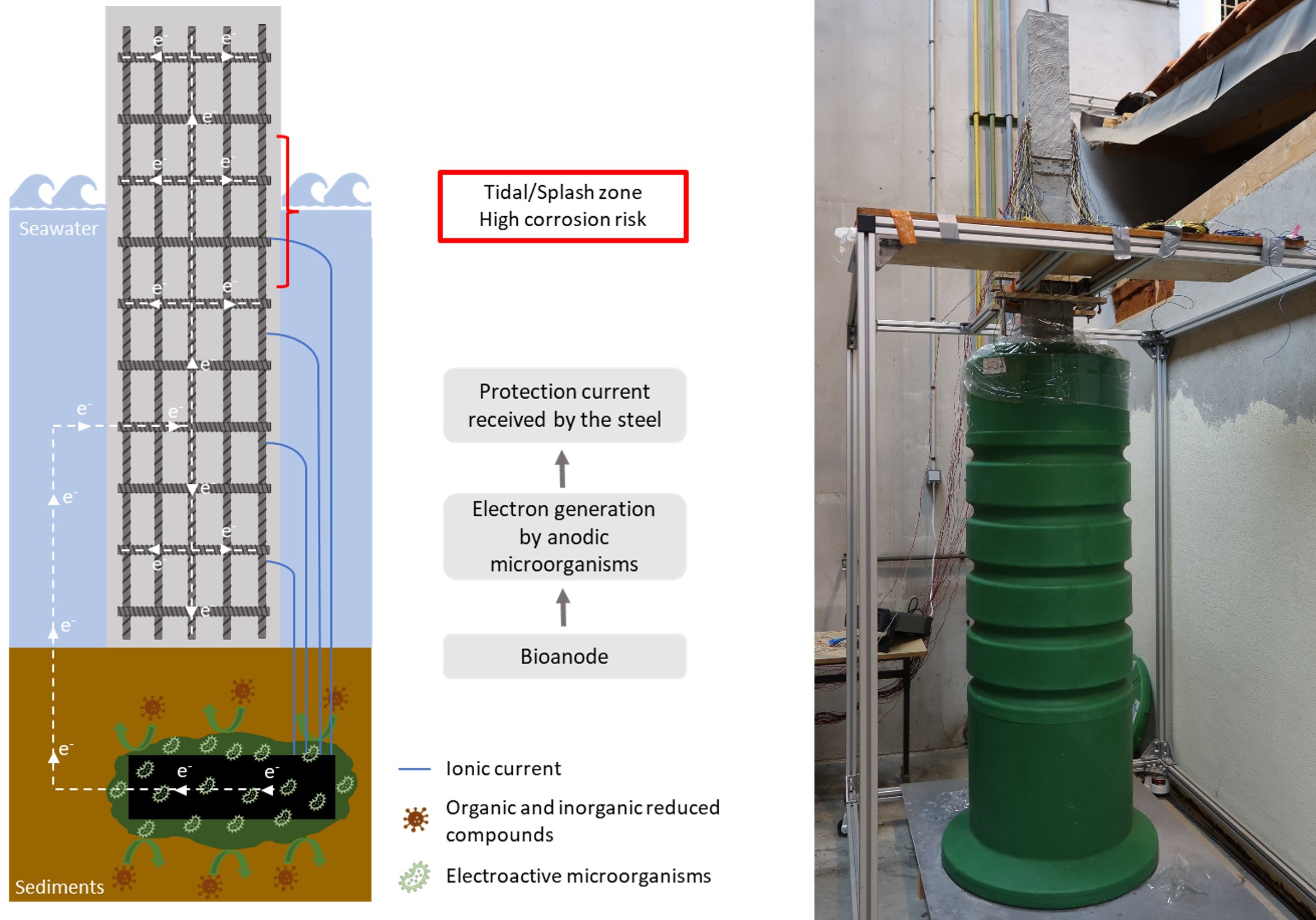 The research conducted aimed to develop and test an innovative, autonomous biogalvanic cathodic protection system, devoid of pollutant emissions, applicable, in particular, to bridge piles embedded in marine sediments, and to port infrastructure. This process utilizes microorganisms naturally present in sediments, without requiring any external inputs. It consists in inserting electrodes into the medium and encouraging local electroactive microbial communities to colonize them. Once established, they activate the electrodes, thereby protecting the structure autonomously and in an environmentally-friendly manner.