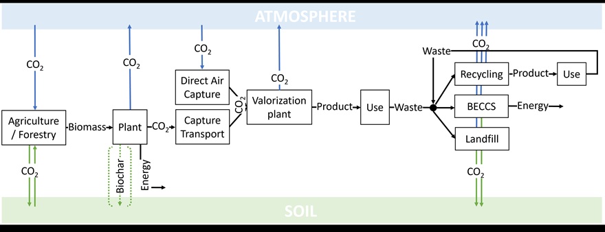 • The relevance of existing recommendations for assessing negative emissions: via a case study, the various existing recommendations were compared and their applicability was verified. In particular, this study showed that allocation, a method previously identified as reliable for assessing emissions, can lead to negative scores (CO2 fixation) being assigned to products within systems where, overall, emissions remain positive. This bias can lead to unfavorable decisions in terms of overall carbon footprint, because an increase in the production volume of a product with “pseudo-negative” emissions will not result in a reduction in the amount of CO2 in the atmosphere, quite the opposite [2].