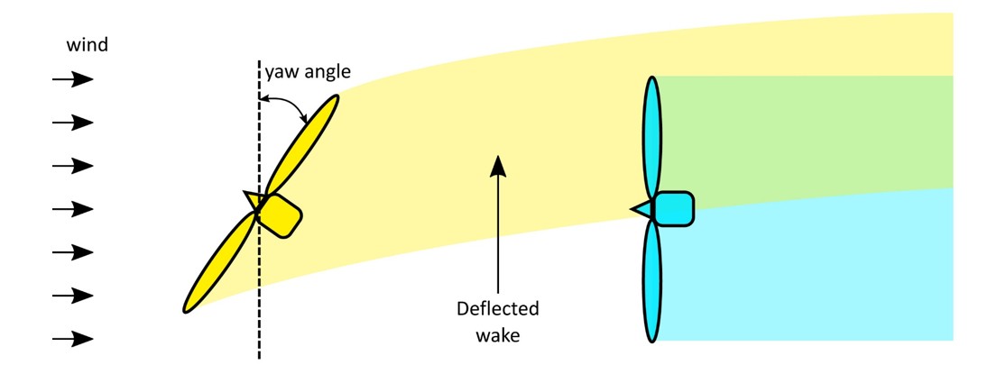 It is possible to influence the wakes by controlling specific turbine actuators. Among these, the yaw angle, defined as the angle between the wind direction and the rotor plane, allows the wake to be deflected and thus potentially provides more energy to the wind turbine affected by it (Figure 2). However, to maximize their individual power, wind turbines are positioned perpendicular to the direction of the prevailing wind (i.e., the yaw angle is zero), and decreasing or increasing the value of this angle results in a loss of power for the turbine concerned. The aim is therefore to shift from an individual control strategy to a collective strategy designed to maximize the power supplied on a wind farm scale.