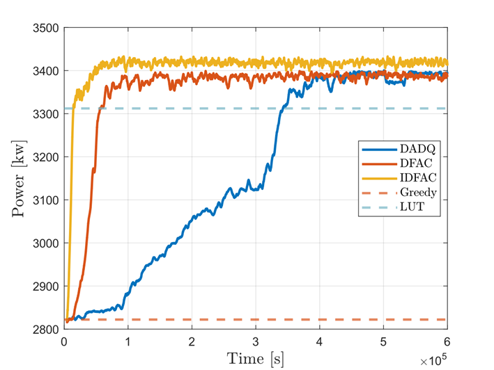 We proposed several decentralized MARL algorithms [1,2,3]. These algorithms are capable of taking into account the dynamic propagation of wakes in wind farms, and they are easy to apply to a large number of turbines due to their decentralized multi-agent nature. These algorithms were evaluated in reference simulators in the wind energy sector, for farms with between 3 and 36 wind turbines. In all cases tested, they enable a significant increase in production of up to 20% and more compared to the conventional strategy (known as “Greedy”) where all wind turbines are oriented to face the wind (Figure 3).