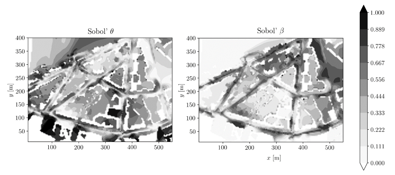 The outputs examined were time-averaged maps related to pollutant concentration and to the probability of threshold exceedance. The uncertainty input variables were: wind direction and speed, traffic volume and composition (proportion of diesel and gasoline vehicles), as well as the road network speed limit. In this way, 2D spatial sensitivity maps (Figure 2) and global sensitivity indices for the entire domain were obtained [2].