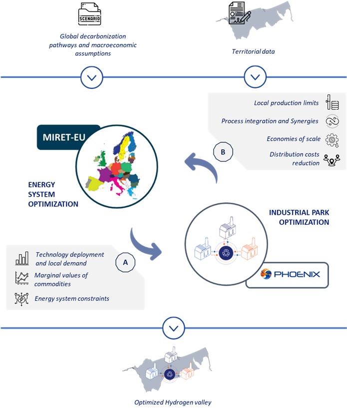 Focusing on the Dunkirk area, this research involved developing an innovative methodology for “soft” coupling between two complementary bottom-up1 optimization models: the MIRET-EU European energy system model (IFPEN) and the PHOENIX industrial site energy-material optimization model (EDF – Mines ParisTech). “Soft” coupling is based on an iterative process that ensures the convergence of results while preserving the consistency specific to each tool.