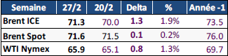 La semaine dernière, les cours du pétrole ont été soutenus en début de période par la persistance des tensions géopolitiques au Moyen-Orient, notamment après une mise en garde des États-Unis concernant la navigation dans le détroit d’Ormuz. En milieu de semaine, les prix ont cependant reculé d’environ 2 $/b. Cette baisse résulte d’une combinaison de facteurs à la fois géopolitiques et structurels. Sur le plan géopolitique, l’ouverture cette semaine à Genève d’un nouveau cycle de négociations entre les États-Unis et l’Iran sur le dossier nucléaire a contribué à apaiser les tensions immédiates liées à l’Iran, réduisant ainsi la prime de risque sur les marchés pétroliers. Du côté de l’offre, plusieurs sources indiquent que l’OPEP+ envisagerait de reprendre ses augmentations de production dès le mois d’avril, une décision qui pourrait être officialisée lors de la réunion du 1er mars. Par ailleurs, l’administration Trump a accéléré la délivrance de dérogations aux sanctions visant le Venezuela, facilitant le retour des investissements dans le secteur pétrolier et ouvrant la perspective d’un rétablissement des niveaux de production d’avant le blocus dès le deuxième trimestre de l’année (autour de 1 Mb/j). Enfin, le dernier rapport mensuel de l’Agence internationale de l’énergie a confirmé une croissance de la demande mondiale plus faible qu’anticipée pour cette année, ainsi qu’un excédent d’offre significatif. Ces éléments, combinés à une forte hausse des stocks hebdomadaires de pétrole aux États-Unis, ont renforcé la pression baissière sur les prix du brut.