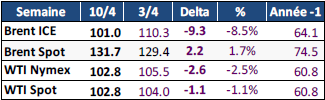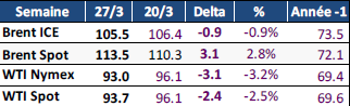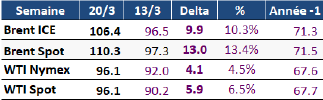 En début de semaine dernière, les prix du pétrole ont reculé d'environ 11 % après l'annonce par les États-Unis d'un report de cinq jours de leur ultimatum de frappes militaires contre les infrastructures énergétiques iraniennes, tandis que les discussions diplomatiques en cours étaient jugées constructives pour désamorcer le conflit. Cependant, en l'absence d'avancée significative entre les deux parties, la poursuite des bombardements mutuels, l'arrivée de nouvelles troupes américaines et surtout le maintien du quasi-blocus du détroit d'Hormuz ont fait repartir les cours à la hausse, clôturant la semaine aux alentours de 113 $/b.
