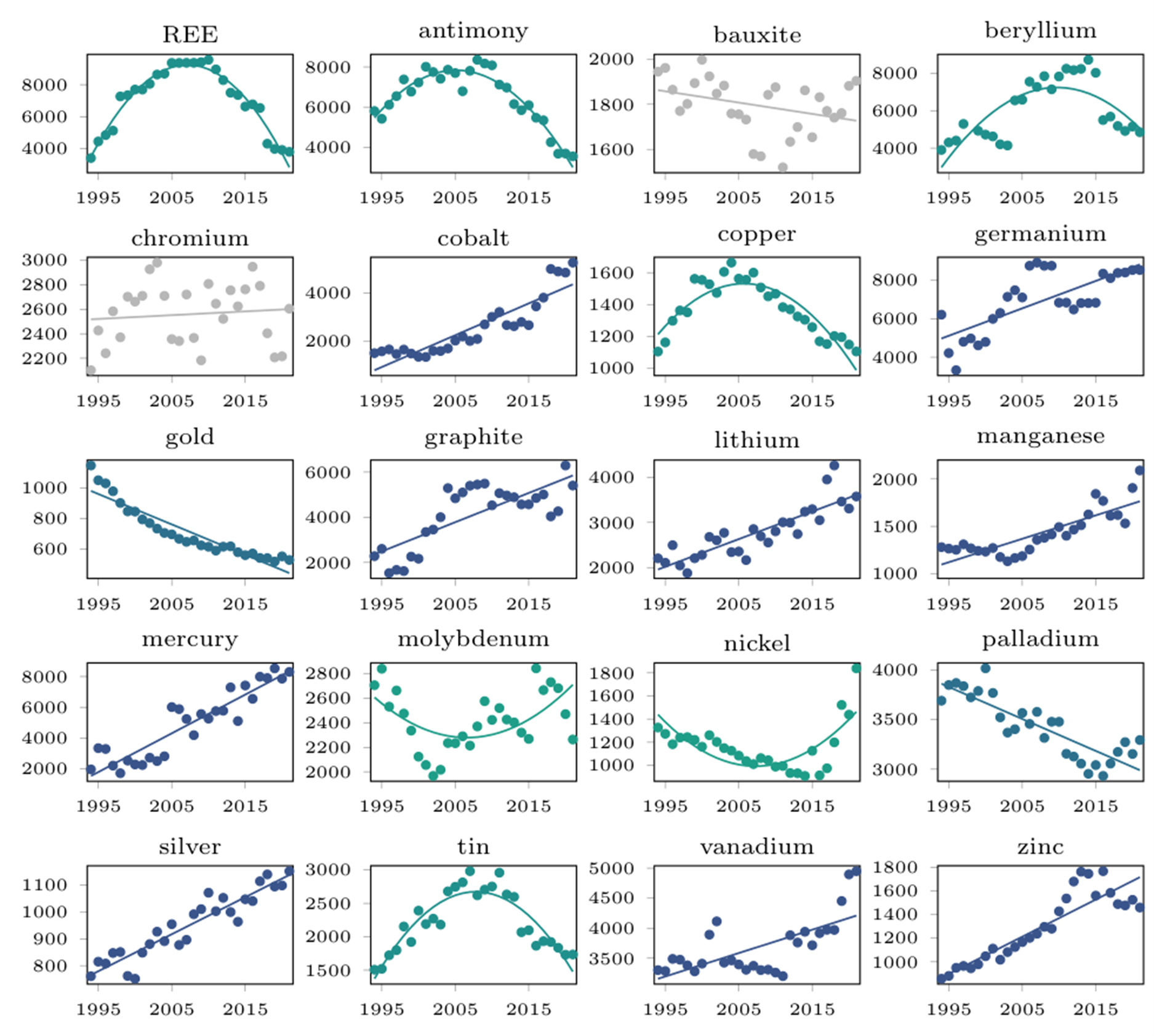 1 Une analyse en panel combine des données pour plusieurs entités (ici, des métaux) observées sur plusieurs années (ici, entre 1994 et 2021).