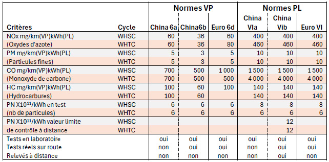 La Chine a adopté des normes d’émissions pour les véhicules particuliers (China6a et China6b) ainsi que pour les poids lourds (ChinaVIa et ChinaVIb), fortement inspirées des standards européens Euro6 et EuroVI. Certaines valeurs limites d’émissions sont d’ailleurs identiques à celles en vigueur en Europe. Cependant, la version «b» des normes pour les véhicules particuliers est encore plus stricte que son équivalent européen. Deux particularités majeures distinguent toutefois ces normes de leurs homologues européennes.