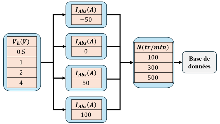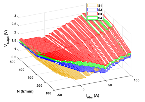 La méthode développée par IFPEN repose sur une base de données expérimentale réduite, enrichie numériquement, ce qui permet de limiter la quantité de données requises et le temps nécessaire à leur acquisition. Cette base comprend 4 amplitudes de tension HF (Vh), 4 niveaux de charge (IAbs) et 3 valeurs de vitesse (N), comme illustré dans la figure 1. L’objectif est de déterminer l’amplitude de tension optimale en équilibrant la qualité de l’estimation de la position et les perturbations induites par l’injection, perçues comme des coûts pour le système.