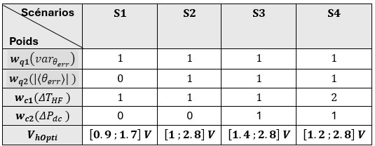 La méthode s’appuie sur plusieurs critères d’évaluation, tels que la minimisation de l’erreur d’estimation de la position et de sa variance, pour garantir la qualité de la position estimée, ainsi que la limitation des oscillations de couple et de la consommation de puissance continue, facteurs pouvant être préjudiciables aux coûts de fonctionnement. Elle permet également de construire différents scénarios d’optimisation afin d’analyser l’influence de chaque paramètre sur le résultat optimal. À titre d’exemple, les figures 2 et 3 présentent 4 scénarios intégrant diverses pondérations des critères qualité et coût et leur impact sur l’amplitude de la tension HF optimale (Vhopti). Les pondérations sont désignées par wq1et wq2 pour les critères de qualité, respectivement liés à la variance de l’erreur d’estimation de la position et à la valeur moyenne de l’erreur et par wc1 et wc2 pour les critères de coûts, correspondant respectivement aux oscillations de couple et à la consommation de puissance continue.