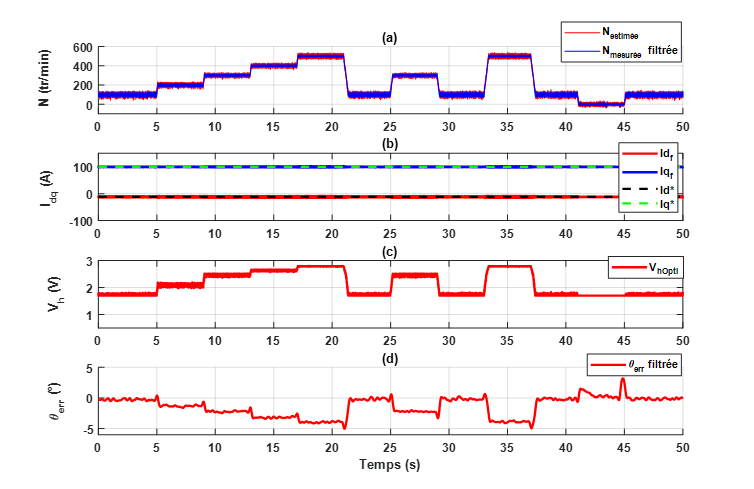 La validation expérimentale de cette méthode, réalisée sur un banc d’essai et illustrée en figure 4, démontre le bon fonctionnement de la commande sans capteur avec une amplitude d’injection variable, sur une plage de vitesses allant de -100 tr/min à 500 tr/min, y compris à l’arrêt. Les résultats présentés dans cette figure ont été obtenus avec l’injection de tension optimisée selon le scénario 2. La sous-figure (a) présente une comparaison entre la vitesse estimée avec la tension HF optimisée (Nestimée), mettant en évidence la bonne convergence de la vitesse estimée. La sous-figure (b) illustre un extrait de la régulation de courant, montrant une comparaison entre les courants mesurés (Idqf) et leurs valeurs de référence (I*dq). La sous-figure (c) affiche la tension HF optimisée (VhOpti), tandis que la sous-figure (d) présente l’erreur d’estimation de la position (θerr) obtenue avec VhOpti.